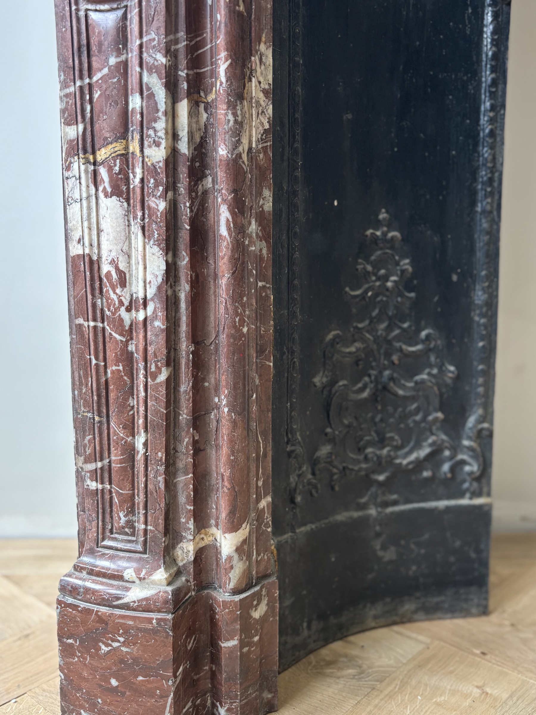 This exceptional fireplace immediately stands out thanks to the visual impact and rarity of its red marble, beautifully veined with white, offering a natural contrast of great elegance. The interplay of light veins running through the stone gives each side a unique appearance, making this fireplace a truly singular piece.