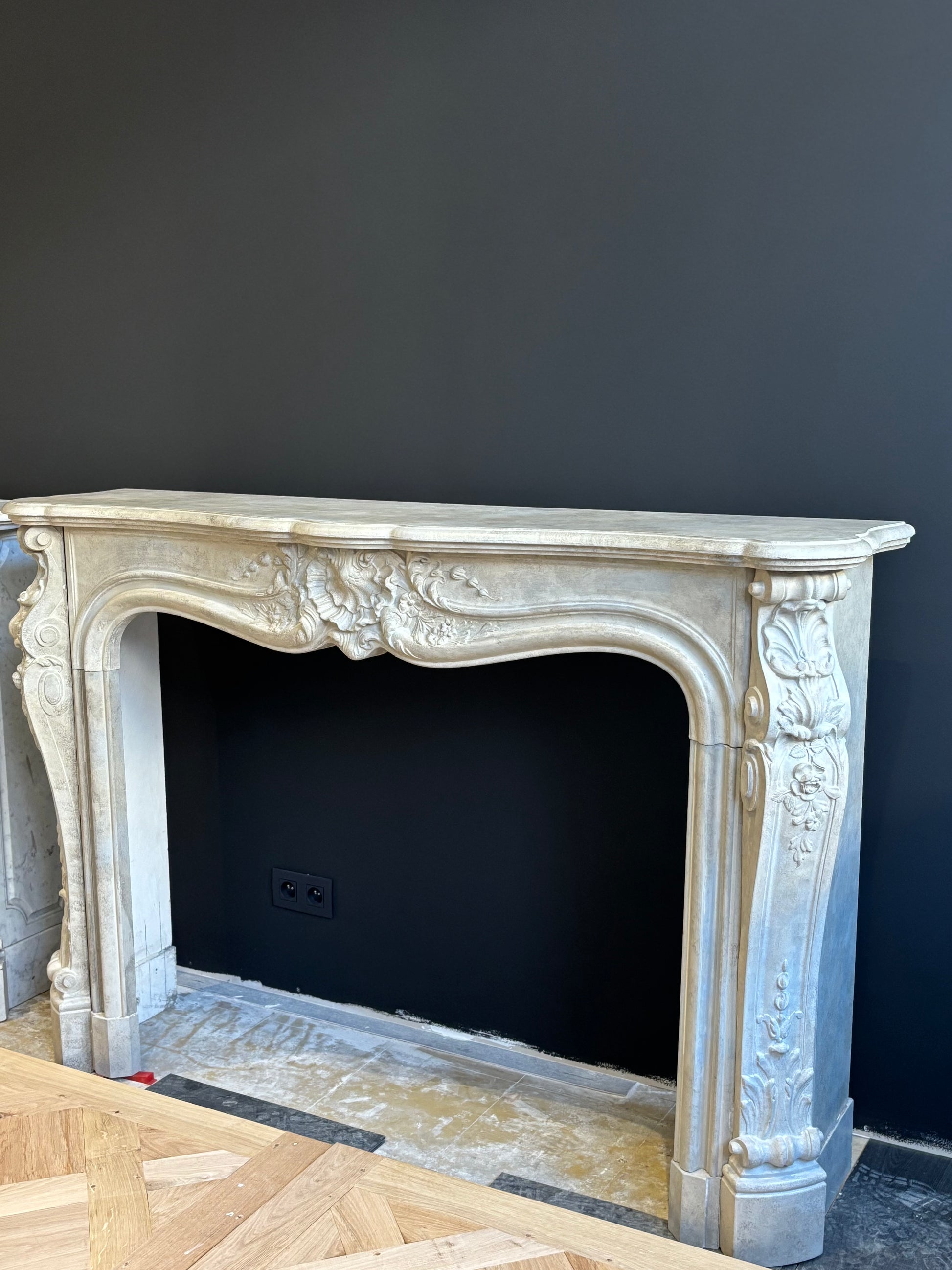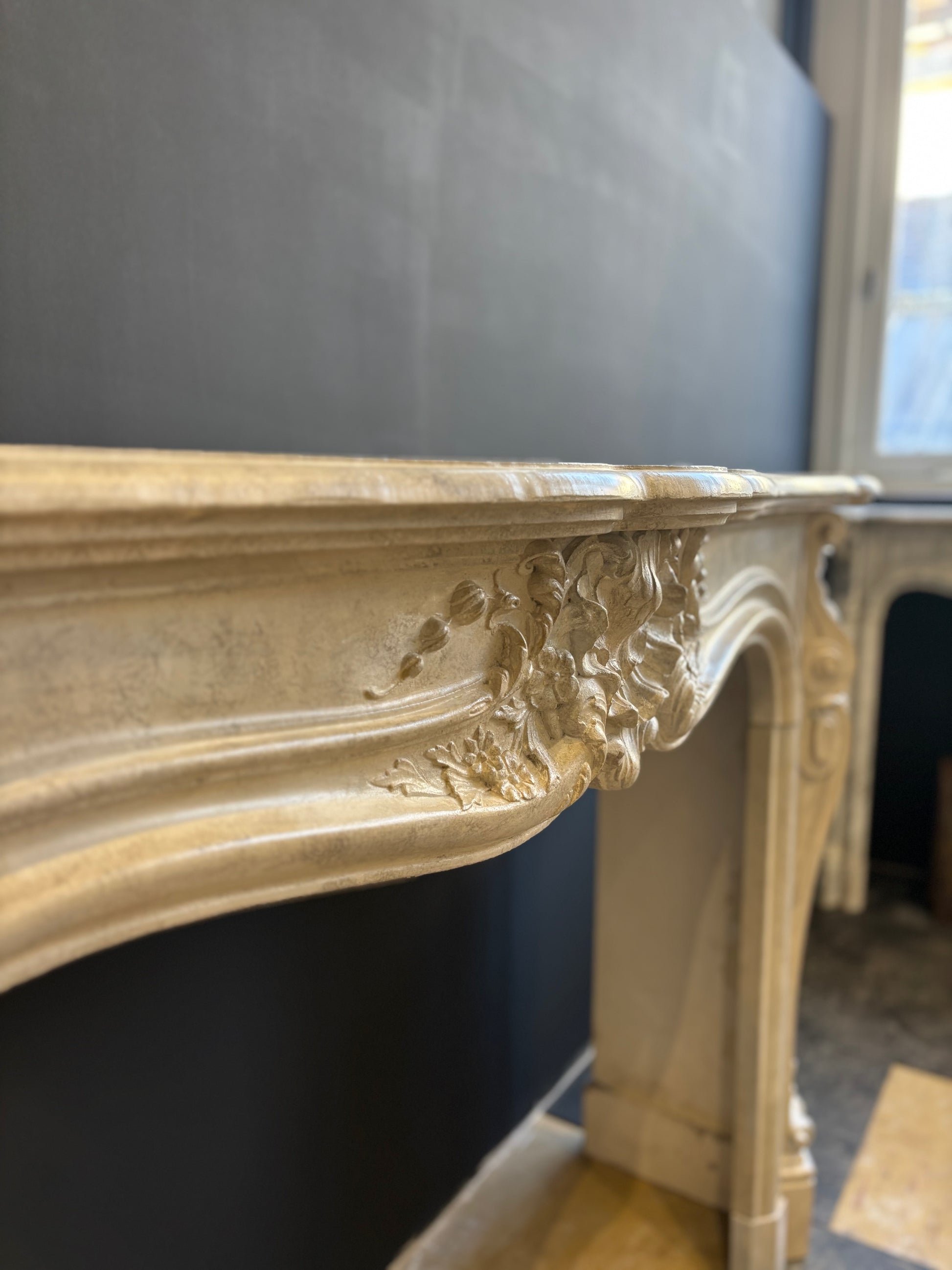 This refined fireplace features exquisitely crafted floral and plant motifs, including flowing leaves, graceful scrolls, and delicately sculpted flowers—signature elements of the Louis XV style. The carving reflects exceptional artisanal know-how, characterized by elegance, movement, and soft, organic lines.